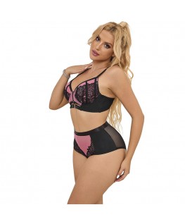 Un meraviglioso e seducente completo intimo due pezzi dal taglio elegante, realizzato in raso rosso eccezionalmente delicato e pizzo squisito in un tono nero profondo. La parte posteriore del corsetto Florencia lascia la schiena perfettamente esposta. Include un reggiseno in raso con sottili spalline regolabili decorate con pizzo. La cintura porta-giarrettiere decorativa, legata sensualmente con un nastro nero in vita, è anch'essa una combinazione di raso e pizzo.